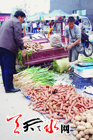 上周,韭菜价格继续占据首位,每斤3.00元,但因鲜嫩程度的不同,也有卖1.50元的。西芹、小芹菜仍然保持每斤2.00元的价位。土豆相比前一周每斤上涨0.20元,售价在1.00元-1.20元之间。菜花相比前一周数量明显减少,价格上扬幅度明显,每斤2.00元。另外,大葱、大蒜、蒜苗、生姜、西红柿、辣椒等与上一周相比,没有出现明显的涨跌态势,价格比较平稳,大葱每斤1.50元,大蒜3.00元,蒜苗2.50元,生姜2.50元。