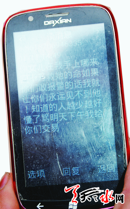 下午1时许,未见女儿回家,父母这才心慌了,于是分头寻找,学校、同学家里,所有能想到的地方都找了,还是没有孩子的踪迹,托着疲惫的身子,小惠的父母一刻也没有停止,继续没有目标地寻找着。到了下午5时许,小惠的父母还是没有孩子的任何消息,就在他们心急如焚时,小惠的母亲接到了一个电话,一男子操着普通话询问,“我给你发的信息你看了吗?”小惠的母亲忙问:“你是谁?我好像不认识你……”没等话说完,对方电话就挂了。小惠的母亲这才意识到由于忙着找孩子,没有注意到手机上发来的信息,她翻开手机,有4条未读短信,第一条信息的显示时间是2013年1月11日14时49分,显示内容为:“你女儿在我手上哪(拿)来40万元救她的命如果你们敢报警的话我就让你们永远见不到他(她)知道的人越少越好懂了骂(吗)明天下午我给你们交易……”。看着这条有好几个错别字的短信,小惠的母亲这才意识到孩子被绑架了,顿时她的腿似有千斤,一步也走不动了,她有气无力地喊来儿子,让儿子拿着手机去找孩子他爸,下午5时17分,小惠的父亲曹先生向麦积公安分局报了案。