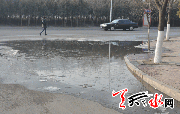 接到反映,记者来到藉河北路与迎宾桥左侧的岔路口处,看到路面低洼处聚集着一大滩污水,污水呈黑黄色,上面飘着一些浮冰。人一走近,一股臭味就直钻鼻腔。这滩污水占据了机动车道的一半路面,来往的车辆都远远地避开污水滩而行。