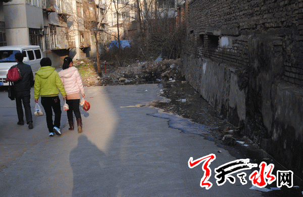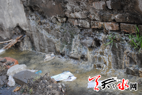 进入原天水锅炉二厂家属区便可看到,污水沿墙根流出近百米,直到流入该家属区1号楼后面的一个水箅子中。被污水渗入的墙根处,锈迹斑斑,水泥大多已脱落,缝隙清晰可见。