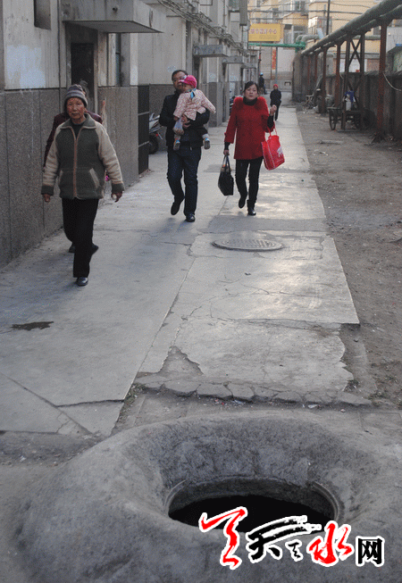 接到反映后,记者当即前往位于秦州区廖家磨的这两个小区采访。记者看到,华港小区最北边的一个化粪池没有了井盖,井口大张,散发出的臭味让途经此处的住户们莫不加快脚步,掩鼻而行。按理说,这个化粪池中的污水应该是向西而流,直至进入小区外的城市污水管网。但是由于其管道堵塞,便渗墙而入,流到了与该小区仅一墙之隔的原天水锅炉二厂家属区。