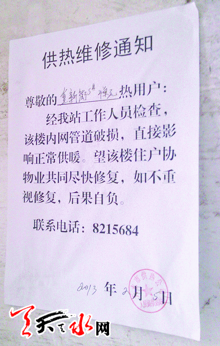 住在四楼和六楼的这些住户说:“暖气停了20多天了,过年那几天大家都待在家里正需要暖气的时候,却一直没暖气,可把大家冻坏了,感冒的娃娃和老人很多。而且停暖的只有我们4、5、6三个单元,1至3单元的暖气并没有停,我们只能每天靠小太阳和电褥子取暖,很费电不说,还不安全、不方便。供热站贴出停暖通知后,我们几户人就找到供热站,可是人家让我们自己把地沟里的水抽干、自己去修管道,然后他们才能送暖。你说我们哪有东西、咋修呢?而且那两天都腊月二十八九了,我们到哪儿找人修去呢?谁愿意在大年三十来抽水呢?再说了,找人修理需要大量的费用,小区没有物业公司,没人组织收钱、组织解决,我们几个住户能咋办呀?”