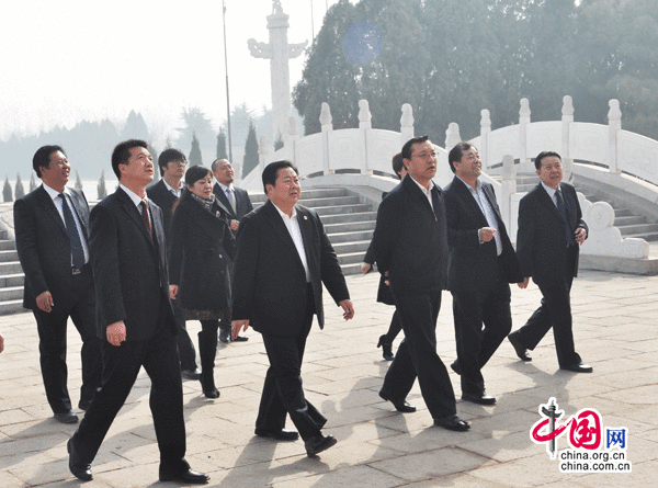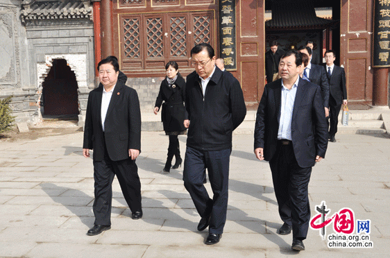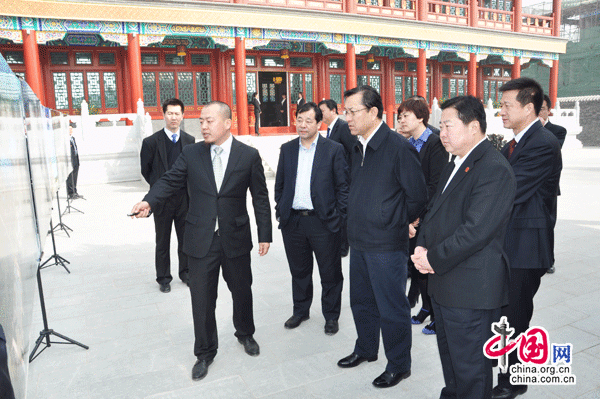 全国人大代表、甘肃省委常委、宣传部部长连辑(中),全国人大代表、天水市委书记马世忠(左)在全国人大代表、盛达集团董事长赵满堂(右)陪同下调研盛世南宫。