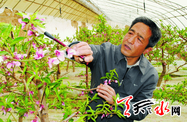 天天天水网-天水晚报讯(记者董刚)3月19日,秦安县南园高新农业科技示范园的技术人员正在桃园进行人工授粉。