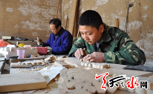 天天天水网讯(记者 孙镇) 近日,工匠们在秦州区贾家公馆内雕刻房屋木制构件。贾家公馆始建于清乾隆年间,2011年被省政府公布为甘肃省第七批省级文物保护单位。