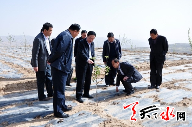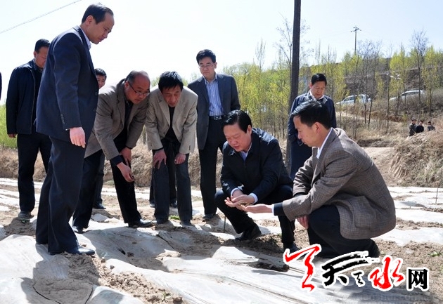 天天天水网讯【记者 王晓馨】4月9日,中共天水市委副书记、市政协主席杨维俊带领市农业、林业部门负责人,深入甘谷县田间地头,就农业农村重点工作和春季农业生产等进行了调研。杨维俊强调,要全力做好防旱抗旱、果树建园、造林绿化等春季农业生产工作,立足自身优势,加快产业结构调整步伐,突出特色,以设施蔬菜产业为重点,大力发展现代农业,千方百计增加农民收入。