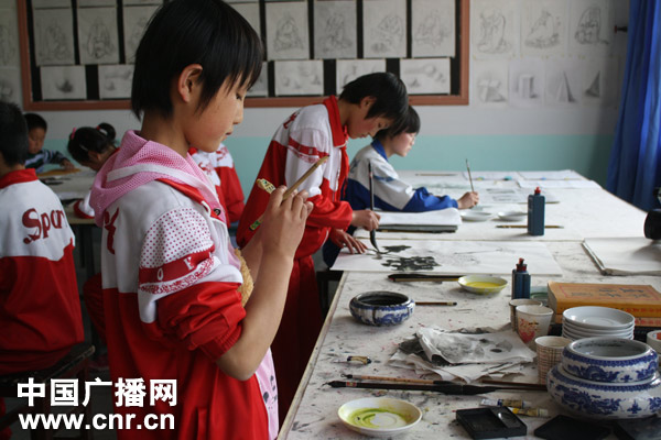 别看年纪不大,他们的一笔一划都显露出训练有素、成熟稳健的风骨。从工整端庄的毛笔小楷到线条细致的人物工笔,墙上挂满了这些孩子们的书画作品,让人赞不绝口。而这些都得益于从2006年开始的教育改革实验。如今,书法绘画已经成为他们每天的必修课。