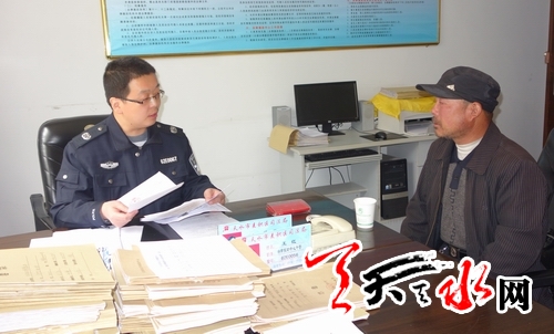 (4月11日,视力残疾的麦积区马跑泉镇三十甸子村村民周正明在麦积区法律援助中心申请法律援助。)