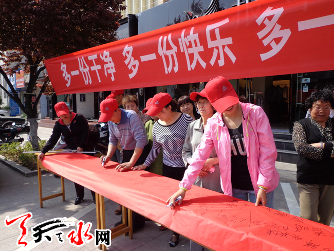 天天天水网讯(记者 张文都)4月27日,秦州区大城街道奋斗巷社区组织辖区居民,在秦州区民主路举行了一场别开生面的签名活动,40多名义务志愿者,郑重签下自己的承诺,这预示着奋斗巷社区为响应秦州区为期三年的城乡环境综合整治拉开了序幕。