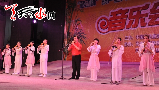 天天天水网讯(记者党小军)5月5日上午,由甘肃移动天水分公司主办,天水市民族吹管乐协会、天水市葫芦丝、巴乌学会协办的“移动情”葫芦丝天水音乐会在秦州剧院举行。素有“葫芦丝王子”美称的中国葫芦丝巴乌专业委员会副会长、葫芦丝演奏家、作曲家、音乐教育家李春华先生应邀出席音乐会,并在场观众展示了精湛的葫芦丝技艺。