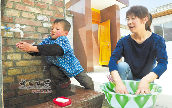甘谷县谢家湾乡沟滩村,一名小朋友用家里的自来水洗手。为了彻底改变当地群众吃水难、吃水不安全的状况,甘谷县积极实施东北部农村饮水安全工程,全面解决了新兴镇、金山乡等东北部4个乡镇65个行政村10余万人的安全饮水问题。本报记者李小龙