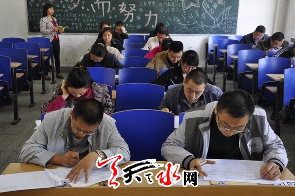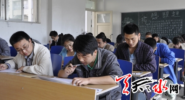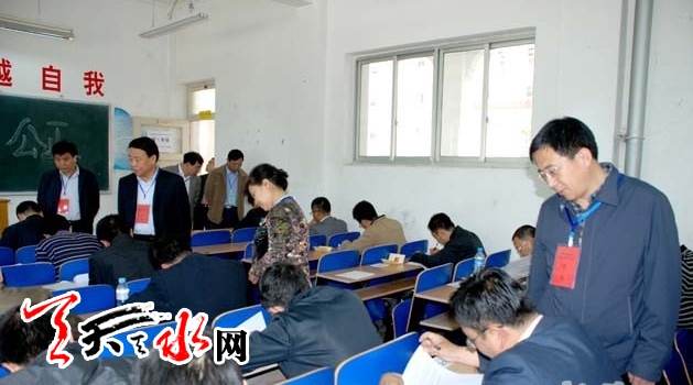 天天天水网讯(记者 王晓馨)5月11日上午9时,天水市2013年市直部门单位科级领导干部竞争上岗笔试在甘肃工业职业技术学院举行。本次笔试共设70个考场,有2096名干部参加,采用闭卷方式进行。按照《竞争上岗办法》规定,参加竞争上岗人员的综合成绩按照任职资格、笔试、面试、民主推荐、领导评价等五个方面综合评定,笔试成绩占25%。天水市领导李美华、王光庆、王子生、何道华巡视考场。