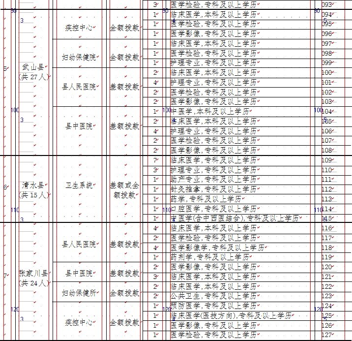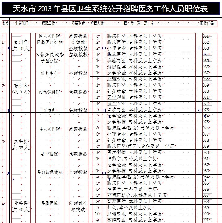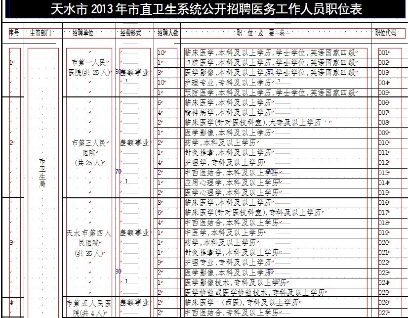 2、天水市2013年县区卫生系统公开招聘医务工作人员职位表