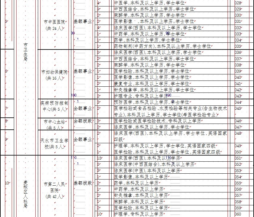 天水籍生源(其中医学类本科和医学影像、检验、麻醉专业的专科毕业生不受生源地限制),并符合下列招聘条件之一: