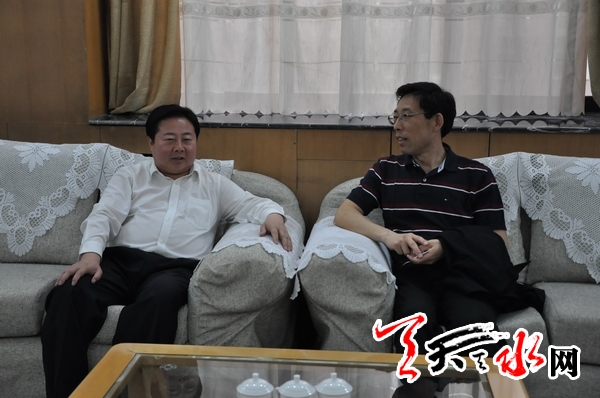 (天水市委书记马世忠与全国政协委员、香港新闻记者联合会主席、大公报董事长兼社长姜在忠亲切交谈。)