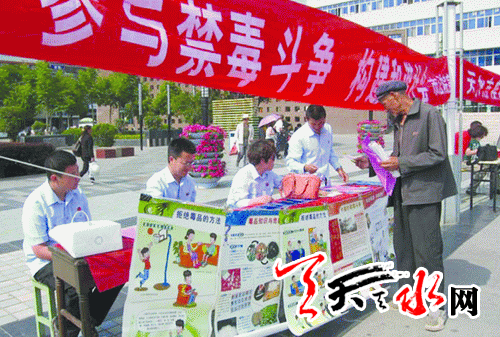 天天天水网讯【记者 景春燕】 6月3日,天水市中级人民法院组织以刑事法官为主的多名工作人员在龙城广场开展了禁毒宣传教育活动。