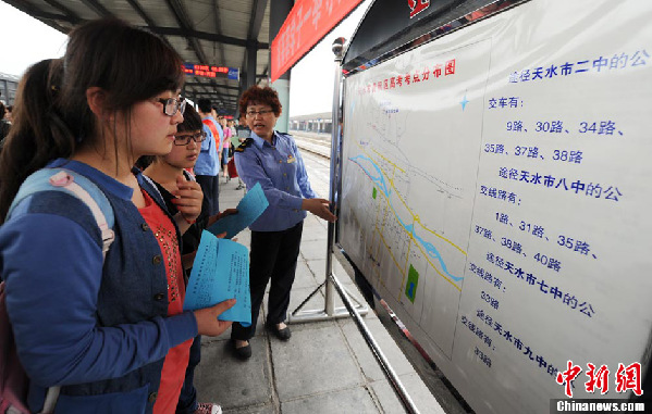 兰州铁路局管辖的天水火车站还专门制作了天水市区高考考点分布图方便来天水赶考的学子们。杨艳敏 摄