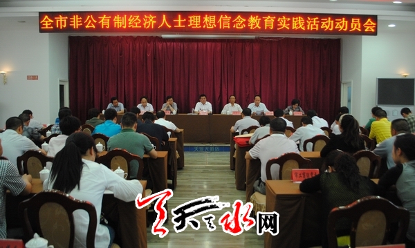 会议传达了中央和省委统战部关于开展非公有制经济人士理想信念教育实践活动的精神,安排部署了天水市非公有制经济人士理想信念教育实践活动。