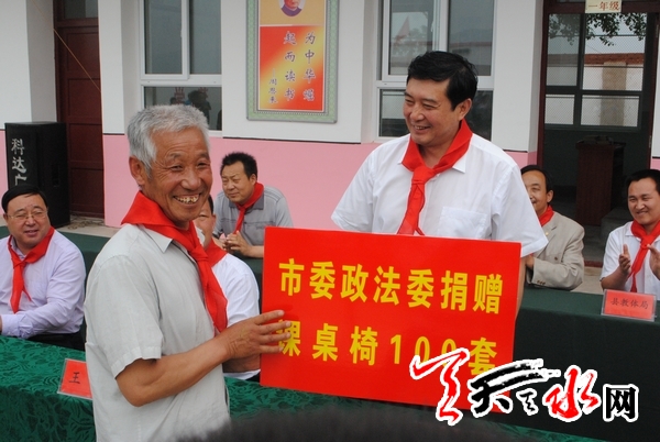 落成典礼仪式上,市政法委还向老庄小学捐赠了100套课桌椅和教育器材。