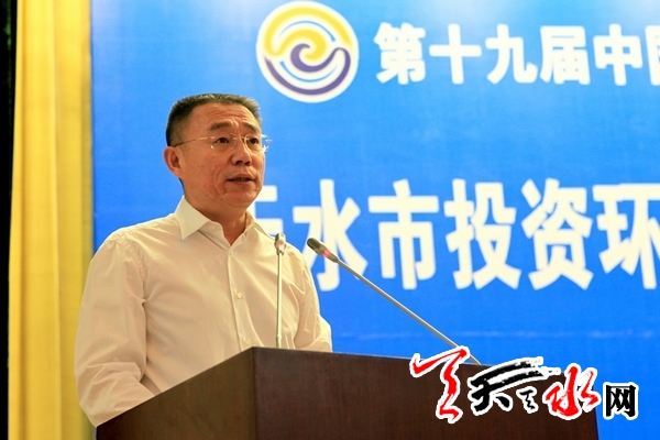王锐在会上就我市基本市情、投资环境和招商引资重点产业作了推介说明。他说,天水是国家规划建设的关中—天水经济区次核心城市和陇东南经济、文化、商贸中心。历史文化悠久,旅游资源富集,是中华民族和中华文明的重要发祥地之一;区位优势明显,工业基础雄厚,是承接产业转移的首选之地;自然条件优越,特色农业发达,是我国北方最佳水果蔬菜生产基地;生态环境良好,城市功能完善,是西北最佳宜居城市;矿产资源丰富,能源供应充足,是发展潜力巨大的投资福地;人力资源充裕,金融网络健全,是充满生机活力的创业热土。诚邀海内外客商来天水实地考察、洽谈对接,欢迎八方宾朋来天水投资兴业、共谋发展。