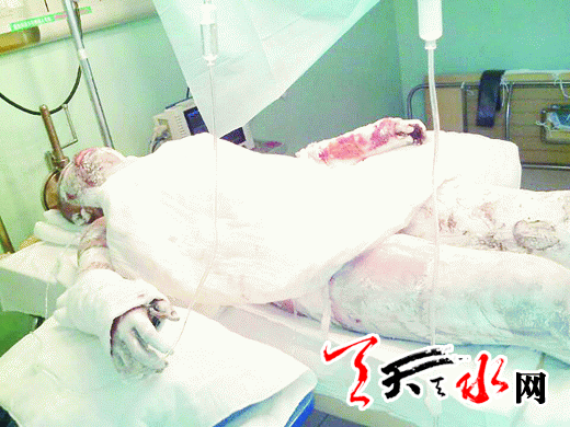 巩芳田哽咽地告诉记者,她家住甘谷县六峰镇苍耳王村,父亲因病早逝,家中有70多岁的爷爷、67岁的奶奶、母亲还有一个姐姐、两个妹妹。小巩和小妹随妈妈的姓,大姐和三妹随父亲的姓。今年6月9日,正当家家户户都开开心心地在一起准备包粽子过端午的时候,小巩突然接到爷爷打来的电话,爷爷在电话中用颤抖的声音告诉她,妈妈巩霞林和正在甘谷一中上学的三妹蒋佳秀因出租屋煤气泄露发生爆炸,顷刻间,来不及逃脱的母亲和妹妹被熊熊大火围困,导致两人全身严重烧伤,现都在兰州陆军总院接受救治。至今五、六天了,妹妹刚刚脱离生命危险。经诊断,母亲和妹妹全身皮肤烧伤面积在80%-90%左右,每天需要一万元的治疗费,听医生说,两人治愈至少要70万元左右的费用,可家里哪儿有能力支付这么庞大的费用。听完爷爷的诉说,小巩心如刀绞。