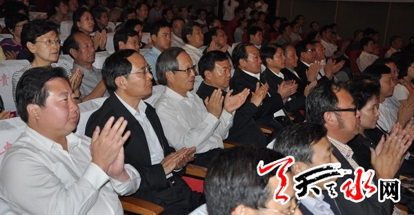 天天天水网讯 6月21日晚,甘肃省委书记、省人大常委会主任王三运,甘肃省委副书记、省长刘伟平,省领导冯健身、欧阳坚、连辑、李建华、李慧、张广智、刘立军、张津梁、张绪胜,以及前来参加公祭伏羲大典的全国政协副秘书长卢昌华,台湾地区新党主席郁慕明,原湖北省委书记、原甘肃省省长贾志杰在马世忠、王锐、杨维俊等市领导的陪同下,在秦州剧院观看大型舞剧《一画开天》。
