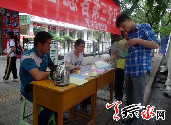 天天天水网讯【记者蔚军平】“节会”期间,社区能为“节会”做些什么?6月21日,在秦州区东关街道团委的组织下,仁和里、十方堂两个社区的志愿者在秦州区新华路设置了志愿服务点,为参加伏羲文化旅游节秦州区商品展示展销暨各地风味美食展销会上的客商以及游人义务提供问路、供应开水、旅游景点推介等服务,在“家门口”为节会出把力,受到了大家的好评。