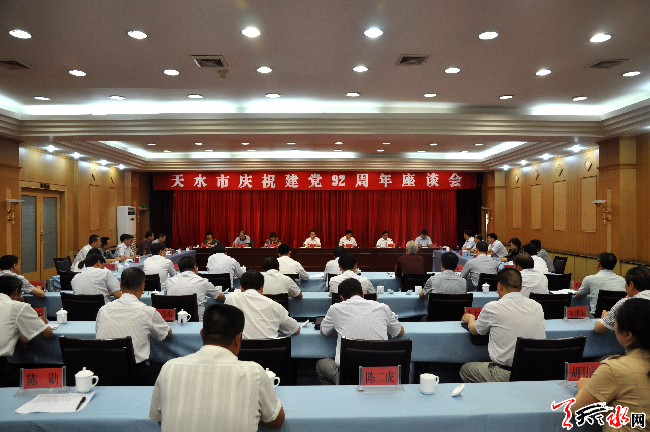天天天水网讯 (记者 孙燕芸) 天水市庆祝建党92周年座谈会7月1日下午在天水迎宾馆召开。全市老党员、先进基层党组织和优秀共产党员代表齐聚一堂,回顾党的光辉历程和丰功伟绩,畅谈我市党的建设和经济社会发展成就,交流基层党组织和党员发挥模范作用的经验和体会,展望“中国梦”天水新篇章,共同庆祝党的生日。