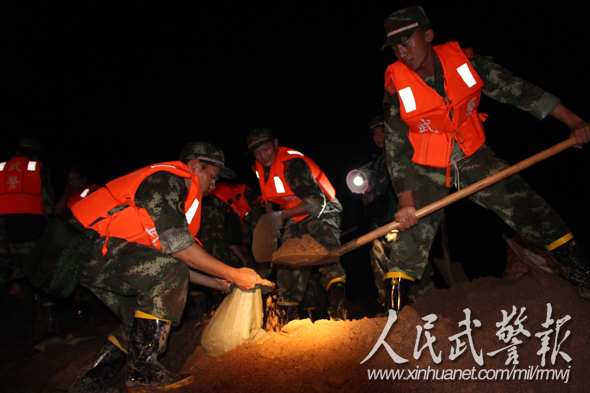 填装沙袋。图片来源:人民武警报