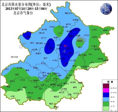受副热带高压外围的暖湿气流和南下弱冷空气的共同影响,昨天(14日)20时开始北京出现明显降雨,雨势总体平缓,西部和北部出现大雨,门头沟、昌平、延庆、怀柔、密云和顺义等地局部地区达到暴雨量级。截至今日(15日)6时,全市平均降雨量达27毫米,最大降雨出现在怀柔大水峪水库,雨量80.0 毫米;最大雨强出现怀柔怀北,5至6时一小时雨量达31.0毫米。