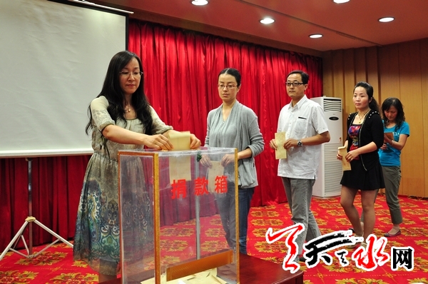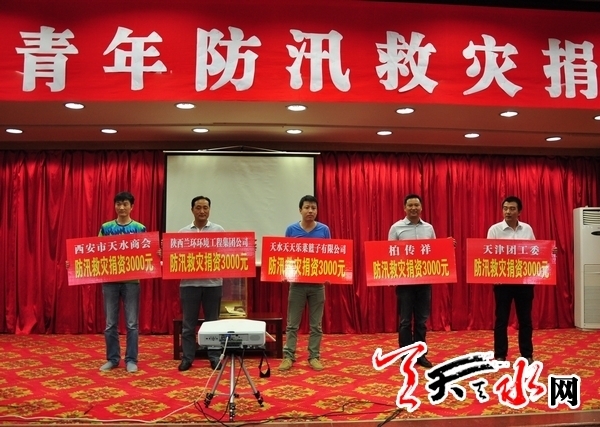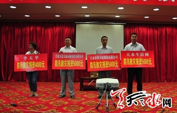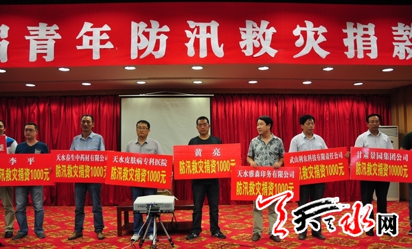 7月19日,天水市举行各界青年防汛救灾捐款仪式,来自全市各行各业的优秀青年代表积极响应为我市特大暴雨灾区捐款捐物的倡议,纷纷伸出援助之手,以实际行动支援灾区。在捐款仪式上,市青年联合会、市青年企业家协会的61家会员单位和集体,团市委机关干部、直属团组织负责人和爱心人士共92人,现场捐款13.1万元。记者 孙镇 摄