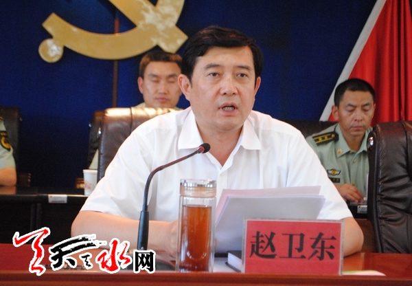 赵卫东代表市委,对武警天水市支队第四次党代会的召开表示祝贺,并就进一步加强支队全面建设讲话强调,武警天水市支队要深刻认识维护社会稳定面临的严峻形势,进一步增强忧患意识和责任意识;要紧紧围绕新时期强军目标,进一步推进现代化武装警察力量建设;大力加强各级党组织建设,进一步提高部队党的建设科学化水平;要积极支援天水经济建设,广泛开展拥政爱民活动,坚决完成市委,市政府交给的各项任务,真正把部队建设成威武之师,文明之师。