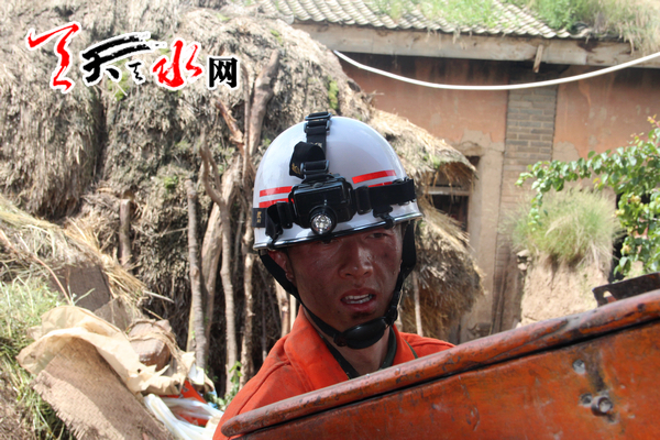 由于进驻永进村的第一突击队需要支援,支队参谋长叶宏林命令白晓东带领队员和第一突击队会合永进村合力救援。已经一天没有吃东西的白晓东又带队紧急赶赴永进村。一进村,就有村民跑过来说,“同志,我的粮食压在倒塌的房子里,没粮食我们没办法活,求你们帮帮我!”“行,走!”,军人的雷厉风行让村民有些激动,连连说“ 谢谢,谢谢!”他带领队员指着一处坍塌房屋的废墟说,“粮食就在这里。”只看见横七竖八的木桩、碎裂的砖瓦、土坯等堆成了一座小山,粮食完全掩盖在废墟下,旁边的主屋裂开了几道手都能伸进去的大口,房顶的瓦片不时从房顶掉落。而此时余震仍然时有发生,一旦发生险情主屋倒塌后果不堪设想。一面是随时可能发生的危险,一面是老百姓期盼的眼神,白晓东没有犹豫、没有后退,果断命令一名队员负责警戒,观察裂缝房屋情况,他和两名突击队员冲到粮食埋压处。