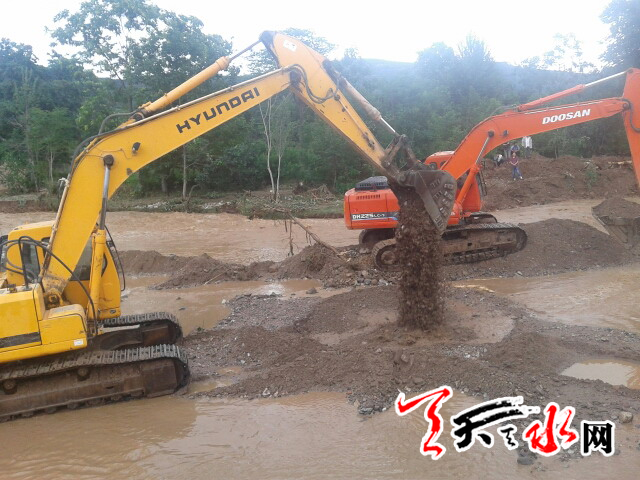 自6月17日至今的40多天里,天水大部分地区连降中到大雨,降雨量是近50年之最。渭河、藉河、东柯河等多条河流水位超过警戒线,山洪暴发,泥石流泛滥,全市多地受灾,当地百姓生命财产受到严重威胁。在天水市施工的中铁十二局集团宝兰客专项目部,6月19日就成立了以项目经理宋振军为组长的抗洪抢险领导小组,对险情进行深刻分析,从抢险方案、技术保障、物资材料、设备、人员、后勤保障各方面进行了组织协调,迅速组织11支抢险队,只要地方政府和甘青铁路有限公司天水指挥部有令,就立即组织人员、机械赶赴抢险地点。6月21日,他们得知麦积镇街亭中学受灾急需抢险,项目书记就在第一时间带领5台大型机械设备向当地政府指定的地点进发。到达现场后,马上会同当地抗洪抢险领导小组制定抢险方案。7月22日至28日,渭南镇、花牛镇等领导要求他们增援,他们闻风而动,立即组织人力物力冲在抢险救灾第一线。在40多天的抗洪抢险中,该项目部共投入抢险人员1600余人次,吊车16台次,挖掘机33台次,装载机50余台次,平板车20余台次,运输车辆100台次,装土编织袋40000余个,方木37方,钢管近11吨,彩条布1万余平方。