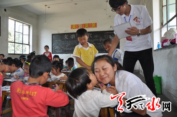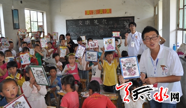 天天天水网讯(记者 徐强)7月29日,秦州区太京镇中学安置点,近50名来自娘娘坝灾区的孩子被团市委组织的6名来自天水师院的志愿者召集起来画画。这天下午,志愿者给孩子们上了第一节课,并和他们一起做游戏,让他们在快乐的游戏中忘记灾害带来的伤痛。据悉,志愿活动将持续到秋季开学。