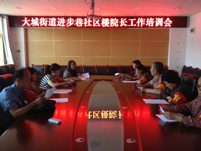 2013年7月31日进步社区组织辖区楼院长召开楼院长业务知识培训会,针对“八大员”(即政策法规宣传员、社情民意的联络员、社会救助的公证员、邻里纠纷的调解员、文明新风的倡导员、文明城市的督查员、人口计生的信息员、社会治安的巡查员)工作职责对楼院长进行相关程序知识的讲解,要求各楼院长定期向社区汇报工作情况,对了解到的社情民意要进行详细记录,并协助社区干部通过走街串巷,对可能出现险情的危房、排洪沟等进行重点排查,及时掌握排摸险情,分类动态管理隐患台账和随时更新巡查记录,确保将隐患消除在萌芽阶段。