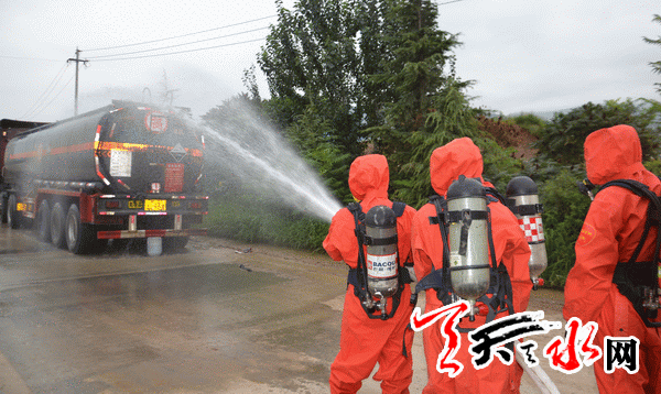 接警后,麦积、特勤两个消防中队的防化洗消、泡沫消防车以及30名官兵于8时40分赶到现场处置。