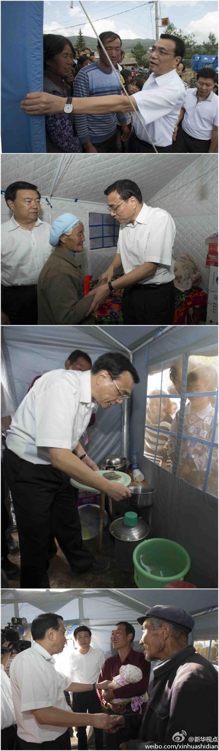 8月17日,李克强总理辗转9小时来到甘肃岷县地震灾区永光村看望受灾群众,考察灾区过渡安置和灾后恢复重建。图片从上到下依次为:1、李克强查看救灾帐篷是不是棉帐篷。2、李克强慰问失去4位亲人的老奶奶。3、李克强查看饮用水是不是干净。4、李克强看到刚出生的小生命,说以后的生活会更好。记者李学仁(来源:新华社“新华视点”微博)