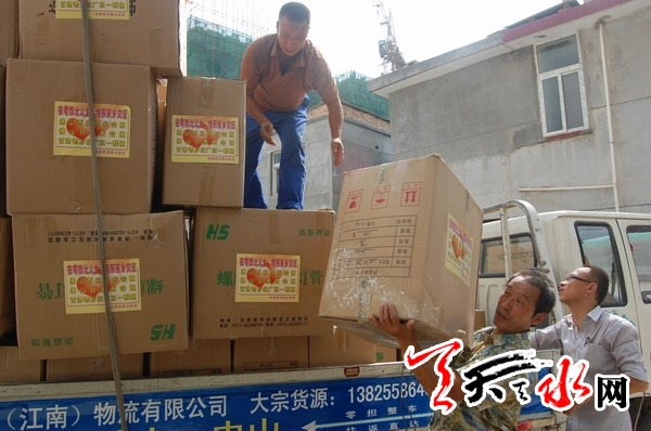 天天天水网讯(记者 吕薇)8月20日,在秦州区民政局救灾物资接收中心正在卸载远在广东的西北儿女为灾区娘娘坝捐赠的物资。