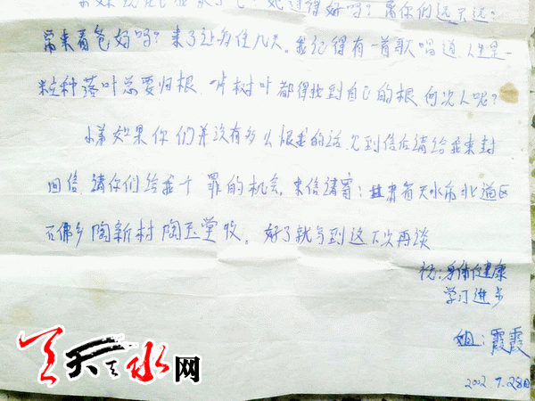 听了赵海龙的讲述,记者也为他们一家骨肉分离三十多年无法相见而感慨万千,于是决定根据赵海龙提供的线索,赴麦积区石佛镇打探赵霞霞的下落。