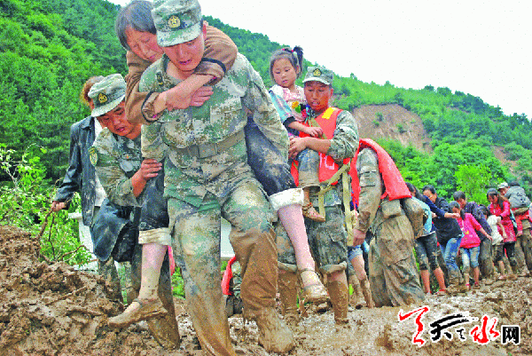 哪里群众最需要,哪里就有子弟兵。7月25日的暴洪灾害发生后,7月26日上午6时,武警甘肃总队天水支队的40名官兵,就携带铁锹、洋镐、救援绳、对讲机等救援器材,奉命紧急驰援娘娘坝镇郭家鞍子村。由于受灾村的道路坍塌中断,只能徒步行进,武警支队官兵历时6个小时,徒步行进百余多公里,于中午12时左右到达郭家鞍子村。