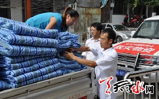 “娘娘坝又受灾了……”7月25日上午,正在去医院路上的秦州区工商联主席胡起瑞顾不上打吊针,一到单位就喊:“小张,通知大家开会,为灾区募集捐助救灾物资。”他自己先带头捐款300元。不到半天的捐赠活动,募集到来自天水华厦建筑工程有限公司、天水成纪药业有限公司、天水诚兴建筑工程有限公司等19家企业及个人捐赠物资价值约8万多元的救灾物资。截至8月1日,甘肃方大建筑工程有限公司、天水宏昇房地产开发有限公司、天水飞燕水泥制品有限公司、天水麦西尔食品有限公司、新宏洲商贸有限公司等多家会员企业捐助资金及物资达119.6万元,给灾区送去了罐头、床、方便面、桃酥、食盐、洗脸盆,毛巾、香皂、洗衣粉等生活用品。