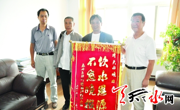 天天天水网-天水晚报讯【记者柏拓】8月30日,受秦州区汪川镇镇长石成玉之托,该镇柏阳村村支书柏宋全和村文书杨护才代表全体村民,将一面写有“饮水思源 不忘晚报”的锦旗送到了本报,表达了对本报报道引来捐助,解决了他们村108户756口人吃水难题的谢意。