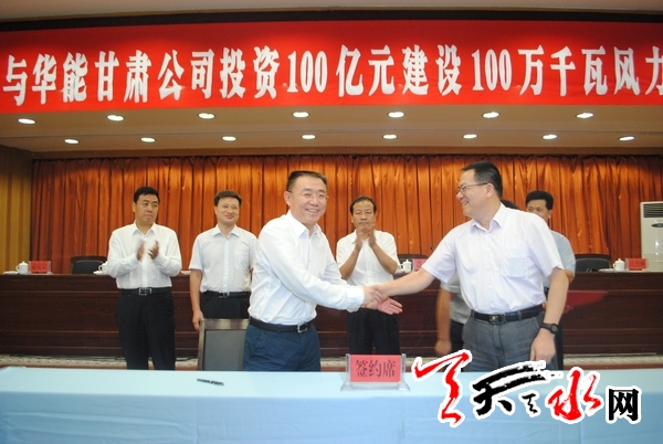 天天天水网讯【记者 令文慧】 9月2日下午,天水市政府与华能甘肃能源开发有限公司在天水迎宾馆签订百万千瓦风力发电项目合作协议。按照协议约定,华能甘肃能源开发有限公司将投资100亿元,在我市秦州、武山、甘谷、秦安、清水一区四县建设100万千瓦风力发电项目。该项目的成功签约标志着我市新能源产业发展将步入一个新阶段。