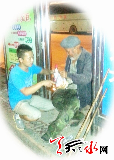 9月1日凌晨,在秦州区绿色市场公交站点,一名年轻小伙子将一瓶矿泉水及几个热乎乎的饼子,递给了一位年近七旬的老人。其关怀备至的神情和动作,莫不让途经此处的路人动容。