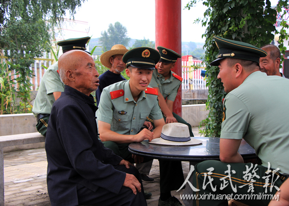 与老人们拉家常。图片来源:人民武警报