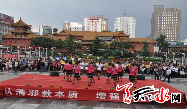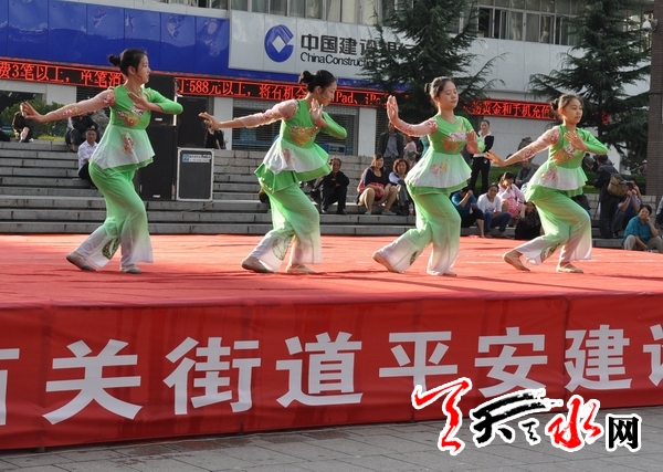 天天天水网-天水晚报讯【记者蔚军平】9月12日,秦州区西关街道办在龙城广场举行了平安建设文艺演出,来自自由路、永庆路等社区的干部、居民,通过诗歌朗诵《崇尚科学,抵制邪教》、快板三句半《拒绝邪教有法宝》以及独唱、舞蹈、音乐情景剧等不同形式的节目齐唱“平安曲”,抒发了大家积极参与平安创建活动的热情。
