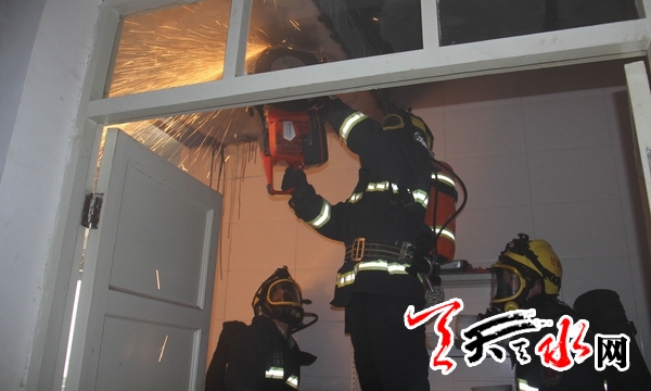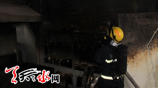 天水郡消防中队官兵接到报警后迅速赶到现场,由于餐厅内弥漫着浓烟,能见度底,经查看,排烟管道当时已被烧得火红,室内温度极高,烟道一旦被烧穿,将会引发大面积燃烧,从而造成重大的财产损失。