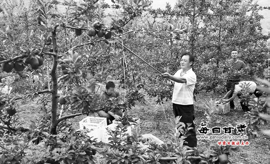 天水市麦积区果农在采摘花牛苹果。眼下,该市110万亩花牛苹果喜获丰收,洽谈收购的客商络绎不绝。 本报记者 吕建荣