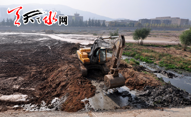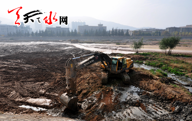 11月3日,施工人员在天水湖一号坝以上进行围堰加固和沉泥清理工作。